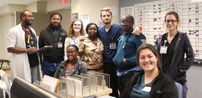 Avant de retourner au chevet d’un patient, Josée prend quelques secondes pour raconter une histoire qui fait éclater de rire ses collègues.