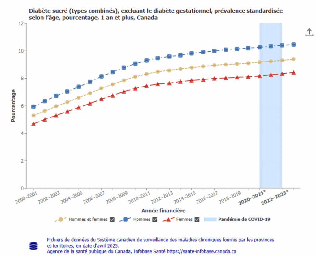 Le diabète est l’une des maladies chroniques les plus répandues au Canada. Au Canada, environ 3,8 millions de personnes âgées de plus d’un an obtiennent un diagnostic de diabète (9,6 % de la population). Et ce nombre exclut le diabète de grossesse. De plus, plus de 6 % des adultes au Canada vivent avec le prédiabète qui est une condition qui augmente leurs chances de développer le diabète de type 2.