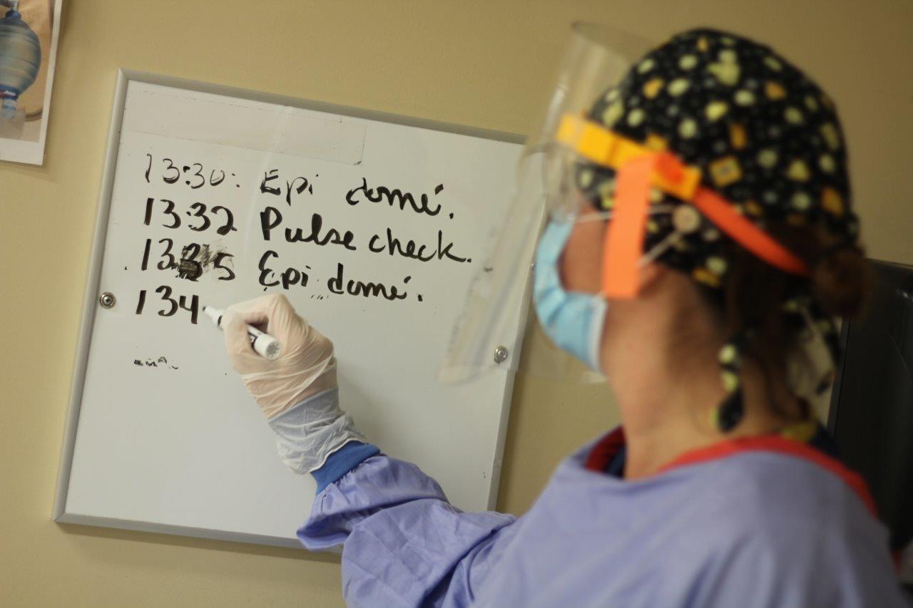 Simulation. Normalement, on doit porter un masque N95, mais nous tenions à les préserver.